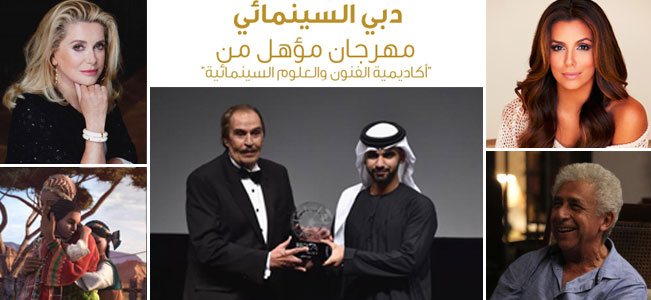 واعتلى المنصة الرئيسية للحفل سمو الشيخ منصور بن محمد بن راشد آل مكتوم، الذي سلّم جائزة «تكريم إنجازات الفنانين» المرموقة إلى ثلاثة من عمالقة السينما، الممثل المصري الكبير عزت العلايلي، والذي امتدت مسيرته الفنية أكثر من خمسة عقود، ويملك تاريخاً سينمائياً عظيماً. ومنحت الجائزة الثانية للمثل الهندي القدير نصر الدين شاه، الذي شارك في أكثر من 200 فيلم على مدى 40 عاماً، وقدمت أيضاً إلى واحدة من أكثر الممثلات تميزاً وحضوراً، وهي الفرنسية كاترين دينوف التي ظهرت في أكثر من 120 فيلماً عالمياً.