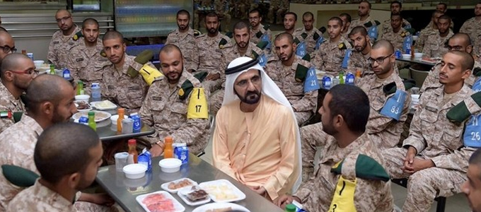 شارك صاحب السمو الشيخ محمد بن راشد آل مكتوم، نائب رئيس الدولة رئيس مجلس الوزراء حاكم دبي، رعاه الله، أبناءه مجندي الخدمة الوطنية طعام الإفطار، أثناء زيارة سموه، يرافقه ولي عهده، سمو الشيخ حمدان بن محمد بن راشد آل مكتوم، إلى مدرسة الخدمة الوطنية التابعة لحرس الرئاسة، في منطقة سيح حفير على الطريق بين أبوظبي ودبي.