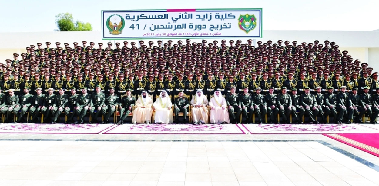 رعى صاحب السمو الشيخ محمد بن راشد آل مكتوم نائب رئيس الدولة رئيس مجلس الوزراء حاكم دبي، رعاه الله، احتفال القوات المسلحة بتخريج الدورة الـ41 من المرشحين الضباط في كلية زايد الثاني العسكرية في مدينة العين، صباح أمس.