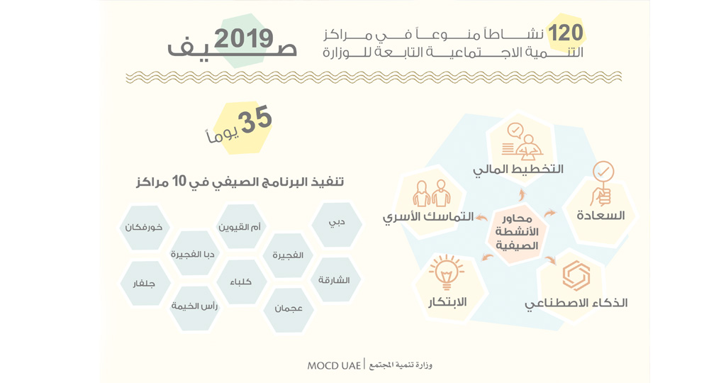 أعلنت وزارة تنمية المجتمع عن إطلاقها البرنامج الصيفي في مراكز التنمية الاجتماعية العشرة التابعة لها والمنتشرة في مختلف إمارات ومناطق الدولة، والتي تبدأ مطلع شهر يوليو الجاري وتستمر إلى منتصف أغسطس المقبل، بفعاليات ومبادرات تنموية واجتماعية موجّهة لجميع الشرائح المجتمعية؛ الأسرة وكبار مواطنين وطلبة المدارس وسواهم من الفئات المجتمعية.