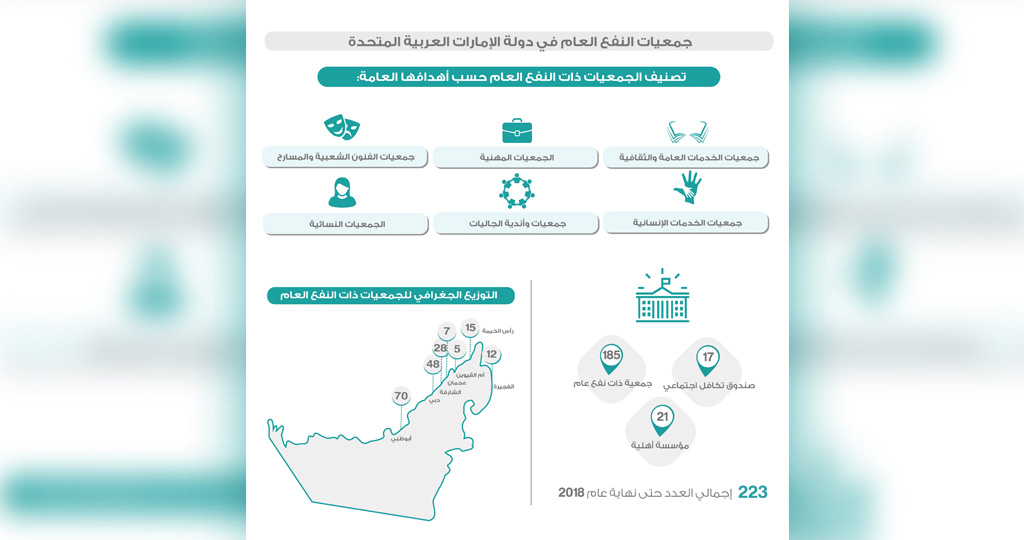 بلغ عدد الجمعيات ذات النفع العام والمؤسسات الأهلية وصناديق التكافل الاجتماعي التي تتولى وزارة تنمية المجتمع الإشراف والرقابة عليها وتقديم الدعم الفني لها 223، منها 185 جمعية و17 صندوق تكافل و21 مؤسسة أهلية على مستوى الدولة مسجلة ضمن قاعدة بيانات الوزارة حتى نهاية العام 2018، وتنقسم تلك الجمعيات إلى مجموعة فئات وتستحوذ فئة جمعيات الخدمات العامة والثقافية على العدد الاكبر من الجمعيات بواقع 63 جمعية تليها الجمعيات المهنية 34، والفنون الشعبية 29، والخدمات الإنسانية 23، وجمعيات وأندية الجاليات 15، والمسارح 10 والجمعيات النسائية بواقع 8 جمعيات .